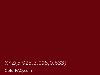XYZ 5.925,3.095,0.633 Color is a very dark red color and the nearest color is Rosewood #65000b. Hex code #69030c and RGB value is rgb(105,3,12). In RGB color space, this color is composed of 41% red, 1% green, 5% blue, In CMYK color space, this color is composed of 0% cyan, 97% magenta, 89% yellow , 59% black , In HSL color space, this color has a hue angle of 355° , 94% saturation and 21% lightness.