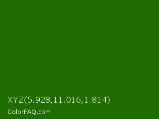 XYZ 5.928,11.016,1.814 Color is a very dark green color and the nearest color is Lincoln Green #195905. Hex code #1f6c00 and RGB value is rgb(31,108,0). In RGB color space, this color is composed of 12% red, 42% green, 0% blue, In CMYK color space, this color is composed of 71% cyan, 0% magenta, 100% yellow , 58% black , In HSL color space, this color has a hue angle of 103° , 100% saturation and 21% lightness.