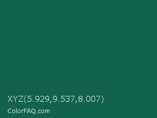 XYZ 5.929,9.537,8.007 Color is a dark green color and the nearest color is Jewel #126b40. Hex code #11634a and RGB value is rgb(17,99,74). In RGB color space, this color is composed of 7% red, 39% green, 29% blue, In CMYK color space, this color is composed of 83% cyan, 0% magenta, 25% yellow , 61% black , In HSL color space, this color has a hue angle of 162° , 71% saturation and 23% lightness.