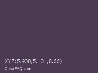 XYZ 5.938,5.131,8.66 Color is a dark purple color and the nearest color is Purple Taupe #50404d. Hex code #4b3a52 and RGB value is rgb(75,58,82). In RGB color space, this color is composed of 29% red, 23% green, 32% blue, In CMYK color space, this color is composed of 9% cyan, 29% magenta, 0% yellow , 68% black , In HSL color space, this color has a hue angle of 283° , 17% saturation and 27% lightness.