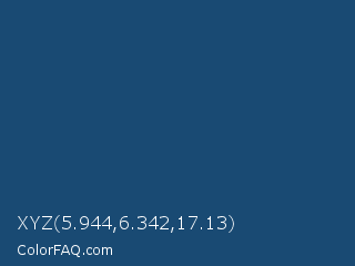 XYZ 5.944,6.342,17.13 Color is a dark blue color and the nearest color is Chathams Blue #175579. Hex code #194a73 and RGB value is rgb(25,74,115). In RGB color space, this color is composed of 10% red, 29% green, 45% blue, In CMYK color space, this color is composed of 78% cyan, 36% magenta, 0% yellow , 55% black , In HSL color space, this color has a hue angle of 207° , 64% saturation and 27% lightness.