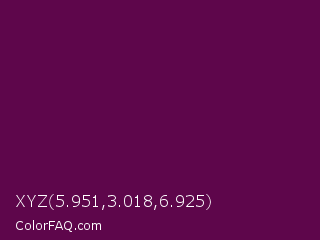 XYZ 5.951,3.018,6.925 Color is a very dark magenta color and the nearest color is Pompadour #660045. Hex code #5e064b and RGB value is rgb(94,6,75). In RGB color space, this color is composed of 37% red, 2% green, 29% blue, In CMYK color space, this color is composed of 0% cyan, 94% magenta, 20% yellow , 63% black , In HSL color space, this color has a hue angle of 313° , 88% saturation and 20% lightness.