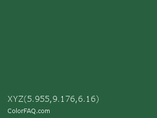XYZ 5.955,9.176,6.16 Color is a dark green color and the nearest color is Green Pea #1d6142. Hex code #28603f and RGB value is rgb(40,96,63). In RGB color space, this color is composed of 16% red, 38% green, 25% blue, In CMYK color space, this color is composed of 58% cyan, 0% magenta, 34% yellow , 62% black , In HSL color space, this color has a hue angle of 145° , 41% saturation and 27% lightness.
