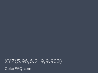 XYZ 5.96,6.219,9.903 Color is a dark blue color and the nearest color is Gun Powder #414257. Hex code #3e4757 and RGB value is rgb(62,71,87). In RGB color space, this color is composed of 24% red, 28% green, 34% blue, In CMYK color space, this color is composed of 29% cyan, 18% magenta, 0% yellow , 66% black , In HSL color space, this color has a hue angle of 218° , 17% saturation and 29% lightness.