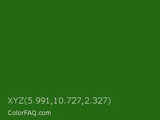 XYZ 5.991,10.727,2.327 Color is a dark green color and the nearest color is Dell #396413. Hex code #246a12 and RGB value is rgb(36,106,18). In RGB color space, this color is composed of 14% red, 42% green, 7% blue, In CMYK color space, this color is composed of 66% cyan, 0% magenta, 83% yellow , 58% black , In HSL color space, this color has a hue angle of 108° , 71% saturation and 24% lightness.