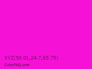 XYZ 50.01,24.7,65.75 Color is a normal magenta color and the nearest color is Hot Magenta #ff1dce. Hex code #f512d6 and RGB value is rgb(245,18,214). In RGB color space, this color is composed of 96% red, 7% green, 84% blue, In CMYK color space, this color is composed of 0% cyan, 93% magenta, 13% yellow , 4% black , In HSL color space, this color has a hue angle of 308° , 92% saturation and 52% lightness.