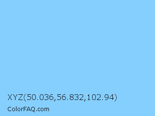 XYZ 50.036,56.832,102.94 Color is a light blue color and the nearest color is Light Sky Blue #87cefa. Hex code #85cfff and RGB value is rgb(133,207,255). In RGB color space, this color is composed of 52% red, 81% green, 100% blue, In CMYK color space, this color is composed of 48% cyan, 19% magenta, 0% yellow , 0% black , In HSL color space, this color has a hue angle of 204° , 100% saturation and 76% lightness.