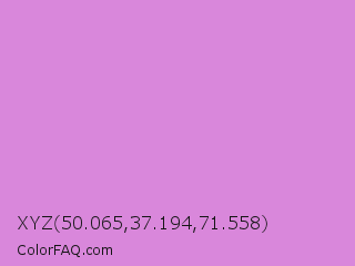 XYZ 50.065,37.194,71.558 Color is a light magenta color and the nearest color is French Mauve #d473d4. Hex code #d987db and RGB value is rgb(217,135,219). In RGB color space, this color is composed of 85% red, 53% green, 86% blue, In CMYK color space, this color is composed of 1% cyan, 38% magenta, 0% yellow , 14% black , In HSL color space, this color has a hue angle of 299° , 54% saturation and 69% lightness.