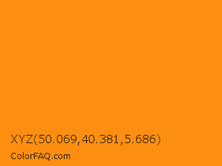 XYZ 50.069,40.381,5.686 Color is a normal orange color and the nearest color is West Side #ff910f. Hex code #fc8f11 and RGB value is rgb(252,143,17). In RGB color space, this color is composed of 99% red, 56% green, 7% blue, In CMYK color space, this color is composed of 0% cyan, 43% magenta, 93% yellow , 1% black , In HSL color space, this color has a hue angle of 32° , 98% saturation and 53% lightness.