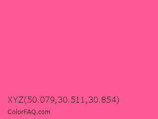 XYZ 50.079,30.511,30.854 Color is a light rose color and the nearest color is Strawberry #fc5a8d. Hex code #ff5993 and RGB value is rgb(255,89,147). In RGB color space, this color is composed of 100% red, 35% green, 58% blue, In CMYK color space, this color is composed of 0% cyan, 65% magenta, 42% yellow , 0% black , In HSL color space, this color has a hue angle of 339° , 100% saturation and 67% lightness.