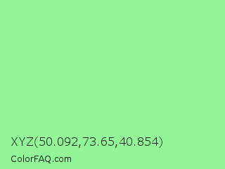 XYZ 50.092,73.65,40.854 Color is a light green color and the nearest color is Pale Green #98fb98. Hex code #92f597 and RGB value is rgb(146,245,151). In RGB color space, this color is composed of 57% red, 96% green, 59% blue, In CMYK color space, this color is composed of 40% cyan, 0% magenta, 38% yellow , 4% black , In HSL color space, this color has a hue angle of 123° , 83% saturation and 77% lightness.