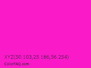 XYZ 50.103,25.186,56.254 Color is a normal magenta color and the nearest color is Hot Magenta #ff1dce. Hex code #fa1ac7 and RGB value is rgb(250,26,199). In RGB color space, this color is composed of 98% red, 10% green, 78% blue, In CMYK color space, this color is composed of 0% cyan, 90% magenta, 20% yellow , 2% black , In HSL color space, this color has a hue angle of 314° , 96% saturation and 54% lightness.