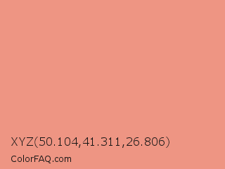 XYZ 50.104,41.311,26.806 Color is a light red color and the nearest color is Dark Salmon #e9967a. Hex code #ee9583 and RGB value is rgb(238,149,131). In RGB color space, this color is composed of 93% red, 58% green, 51% blue, In CMYK color space, this color is composed of 0% cyan, 37% magenta, 45% yellow , 7% black , In HSL color space, this color has a hue angle of 10° , 76% saturation and 72% lightness.