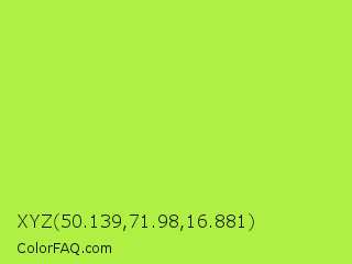 XYZ 50.139,71.98,16.881 Color is a light green color and the nearest color is Conifer #acdd4d. Hex code #b0f045 and RGB value is rgb(176,240,69). In RGB color space, this color is composed of 69% red, 94% green, 27% blue, In CMYK color space, this color is composed of 27% cyan, 0% magenta, 71% yellow , 6% black , In HSL color space, this color has a hue angle of 82° , 85% saturation and 61% lightness.