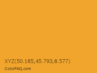 XYZ 50.185,45.793,8.577 Color is a normal orange color and the nearest color is Fuel Yellow #eca927. Hex code #f1a52c and RGB value is rgb(241,165,44). In RGB color space, this color is composed of 95% red, 65% green, 17% blue, In CMYK color space, this color is composed of 0% cyan, 32% magenta, 82% yellow , 5% black , In HSL color space, this color has a hue angle of 37° , 88% saturation and 56% lightness.
