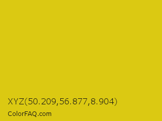 XYZ 50.209,56.877,8.904 Color is a normal yellow color and the nearest color is Bird Flower #d4cd16. Hex code #dbc912 and RGB value is rgb(219,201,18). In RGB color space, this color is composed of 86% red, 79% green, 7% blue, In CMYK color space, this color is composed of 0% cyan, 8% magenta, 92% yellow , 14% black , In HSL color space, this color has a hue angle of 55° , 85% saturation and 46% lightness.