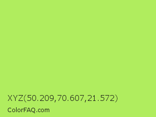 XYZ 50.209,70.607,21.572 Color is a light green color and the nearest color is Inchworm #b2ec5d. Hex code #b0ed5e and RGB value is rgb(176,237,94). In RGB color space, this color is composed of 69% red, 93% green, 37% blue, In CMYK color space, this color is composed of 26% cyan, 0% magenta, 60% yellow , 7% black , In HSL color space, this color has a hue angle of 86° , 80% saturation and 65% lightness.