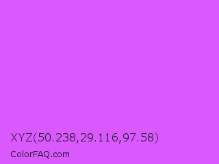 XYZ 50.238,29.116,97.58 Color is a light purple color and the nearest color is Heliotrope #df73ff. Hex code #d959ff and RGB value is rgb(217,89,255). In RGB color space, this color is composed of 85% red, 35% green, 100% blue, In CMYK color space, this color is composed of 15% cyan, 65% magenta, 0% yellow , 0% black , In HSL color space, this color has a hue angle of 286° , 100% saturation and 67% lightness.