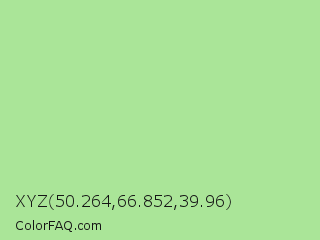 XYZ 50.264,66.852,39.96 Color is a light green color and the nearest color is Granny Smith Apple #a8e4a0. Hex code #aae598 and RGB value is rgb(170,229,152). In RGB color space, this color is composed of 67% red, 90% green, 60% blue, In CMYK color space, this color is composed of 26% cyan, 0% magenta, 34% yellow , 10% black , In HSL color space, this color has a hue angle of 106° , 60% saturation and 75% lightness.