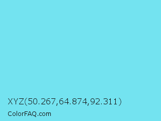 XYZ 50.267,64.874,92.311 Color is a light cyan color and the nearest color is Spray #79deec. Hex code #73e3f0 and RGB value is rgb(115,227,240). In RGB color space, this color is composed of 45% red, 89% green, 94% blue, In CMYK color space, this color is composed of 52% cyan, 5% magenta, 0% yellow , 6% black , In HSL color space, this color has a hue angle of 186° , 81% saturation and 70% lightness.