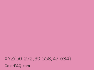 XYZ 50.272,39.558,47.634 Color is a light rose color and the nearest color is Light Thulian Pink #e68fac. Hex code #e58fb3 and RGB value is rgb(229,143,179). In RGB color space, this color is composed of 90% red, 56% green, 70% blue, In CMYK color space, this color is composed of 0% cyan, 38% magenta, 22% yellow , 10% black , In HSL color space, this color has a hue angle of 335° , 62% saturation and 73% lightness.