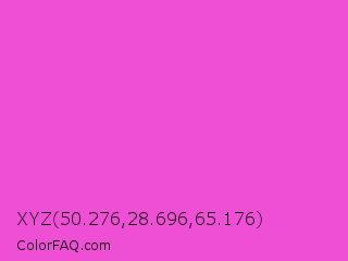 XYZ 50.276,28.696,65.176 Color is a light magenta color and the nearest color is Purple Pizzazz #fe4eda. Hex code #ef4fd4 and RGB value is rgb(239,79,212). In RGB color space, this color is composed of 94% red, 31% green, 83% blue, In CMYK color space, this color is composed of 0% cyan, 67% magenta, 11% yellow , 6% black , In HSL color space, this color has a hue angle of 310° , 83% saturation and 62% lightness.