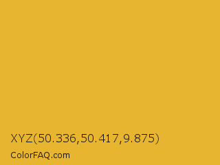 XYZ 50.336,50.417,9.875 Color is a normal orange color and the nearest color is Tulip Tree #eab33b. Hex code #e8b530 and RGB value is rgb(232,181,48). In RGB color space, this color is composed of 91% red, 71% green, 19% blue, In CMYK color space, this color is composed of 0% cyan, 22% magenta, 79% yellow , 9% black , In HSL color space, this color has a hue angle of 43° , 80% saturation and 55% lightness.