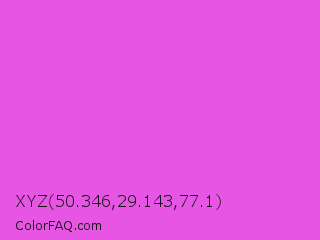 XYZ 50.346,29.143,77.1 Color is a light magenta color and the nearest color is Purple Pizzazz #fe4eda. Hex code #e755e5 and RGB value is rgb(231,85,229). In RGB color space, this color is composed of 91% red, 33% green, 90% blue, In CMYK color space, this color is composed of 0% cyan, 63% magenta, 1% yellow , 9% black , In HSL color space, this color has a hue angle of 301° , 75% saturation and 62% lightness.