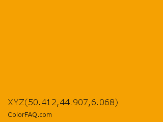 XYZ 50.412,44.907,6.068 Color is a normal orange color and the nearest color is Orange RYB #fb9902. Hex code #f5a102 and RGB value is rgb(245,161,2). In RGB color space, this color is composed of 96% red, 63% green, 1% blue, In CMYK color space, this color is composed of 0% cyan, 34% magenta, 99% yellow , 4% black , In HSL color space, this color has a hue angle of 39° , 98% saturation and 48% lightness.