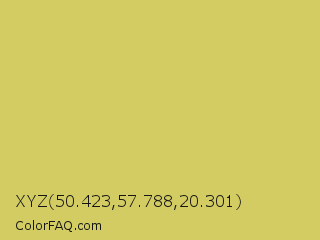 XYZ 50.423,57.788,20.301 Color is a light yellow color and the nearest color is Tacha #d6c562. Hex code #d2cc63 and RGB value is rgb(210,204,99). In RGB color space, this color is composed of 82% red, 80% green, 39% blue, In CMYK color space, this color is composed of 0% cyan, 3% magenta, 53% yellow , 18% black , In HSL color space, this color has a hue angle of 57° , 55% saturation and 61% lightness.