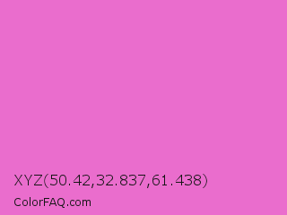 XYZ 50.42,32.837,61.438 Color is a light magenta color and the nearest color is Orchid #da70d6. Hex code #ea6dcd and RGB value is rgb(234,109,205). In RGB color space, this color is composed of 92% red, 43% green, 80% blue, In CMYK color space, this color is composed of 0% cyan, 53% magenta, 12% yellow , 8% black , In HSL color space, this color has a hue angle of 314° , 75% saturation and 67% lightness.
