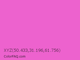 XYZ 50.433,31.196,61.756 Color is a light magenta color and the nearest color is Rose Pink #ff66cc. Hex code #ed62ce and RGB value is rgb(237,98,206). In RGB color space, this color is composed of 93% red, 38% green, 81% blue, In CMYK color space, this color is composed of 0% cyan, 59% magenta, 13% yellow , 7% black , In HSL color space, this color has a hue angle of 313° , 79% saturation and 66% lightness.