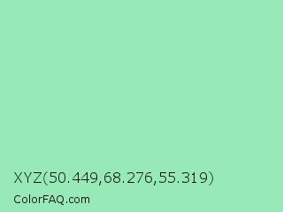 XYZ 50.449,68.276,55.319 Color is a light green color and the nearest color is Teal Deer #99e6b3. Hex code #97e9b7 and RGB value is rgb(151,233,183). In RGB color space, this color is composed of 59% red, 91% green, 72% blue, In CMYK color space, this color is composed of 35% cyan, 0% magenta, 21% yellow , 9% black , In HSL color space, this color has a hue angle of 143° , 65% saturation and 75% lightness.