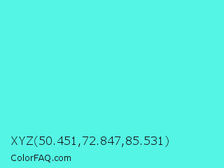 XYZ 50.451,72.847,85.531 Color is a light cyan color and the nearest color is Turquoise #40e0d0. Hex code #54f5e5 and RGB value is rgb(84,245,229). In RGB color space, this color is composed of 33% red, 96% green, 90% blue, In CMYK color space, this color is composed of 66% cyan, 0% magenta, 7% yellow , 4% black , In HSL color space, this color has a hue angle of 174° , 89% saturation and 65% lightness.