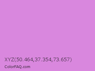 XYZ 50.464,37.354,73.657 Color is a light magenta color and the nearest color is Bright Lilac #d891ef. Hex code #d987de and RGB value is rgb(217,135,222). In RGB color space, this color is composed of 85% red, 53% green, 87% blue, In CMYK color space, this color is composed of 2% cyan, 39% magenta, 0% yellow , 13% black , In HSL color space, this color has a hue angle of 297° , 57% saturation and 70% lightness.