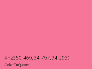 XYZ 50.469,34.797,34.193 Color is a light rose color and the nearest color is Cyclamen #f56fa1. Hex code #f77599 and RGB value is rgb(247,117,153). In RGB color space, this color is composed of 97% red, 46% green, 60% blue, In CMYK color space, this color is composed of 0% cyan, 53% magenta, 38% yellow , 3% black , In HSL color space, this color has a hue angle of 343° , 89% saturation and 71% lightness.