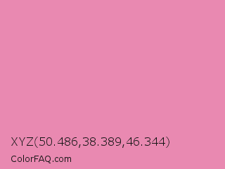 XYZ 50.486,38.389,46.344 Color is a light rose color and the nearest color is Light Thulian Pink #e68fac. Hex code #e989b1 and RGB value is rgb(233,137,177). In RGB color space, this color is composed of 91% red, 54% green, 69% blue, In CMYK color space, this color is composed of 0% cyan, 41% magenta, 24% yellow , 9% black , In HSL color space, this color has a hue angle of 335° , 69% saturation and 73% lightness.