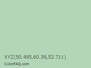 XYZ 50.495,60.39,52.711 Color is a light green color and the nearest color is Gum Leaf #b6d3bf. Hex code #b2d5b5 and RGB value is rgb(178,213,181). In RGB color space, this color is composed of 70% red, 84% green, 71% blue, In CMYK color space, this color is composed of 16% cyan, 0% magenta, 15% yellow , 16% black , In HSL color space, this color has a hue angle of 125° , 29% saturation and 77% lightness.