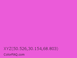 XYZ 50.526,30.154,68.803 Color is a light magenta color and the nearest color is Purple Pizzazz #fe4eda. Hex code #eb5bd9 and RGB value is rgb(235,91,217). In RGB color space, this color is composed of 92% red, 36% green, 85% blue, In CMYK color space, this color is composed of 0% cyan, 61% magenta, 8% yellow , 8% black , In HSL color space, this color has a hue angle of 308° , 78% saturation and 64% lightness.