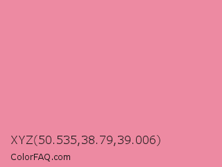 XYZ 50.535,38.79,39.006 Color is a light red color and the nearest color is Carissma #ea88a8. Hex code #ed8aa2 and RGB value is rgb(237,138,162). In RGB color space, this color is composed of 93% red, 54% green, 64% blue, In CMYK color space, this color is composed of 0% cyan, 42% magenta, 32% yellow , 7% black , In HSL color space, this color has a hue angle of 345° , 73% saturation and 74% lightness.