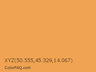 XYZ 50.555,45.329,14.067 Color is a light orange color and the nearest color is Tan Hide #fa9d5a. Hex code #f0a352 and RGB value is rgb(240,163,82). In RGB color space, this color is composed of 94% red, 64% green, 32% blue, In CMYK color space, this color is composed of 0% cyan, 32% magenta, 66% yellow , 6% black , In HSL color space, this color has a hue angle of 31° , 84% saturation and 63% lightness.