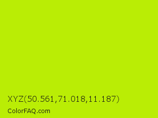 XYZ 50.561,71.018,11.187 Color is a normal lime color and the nearest color is Fuego #bede0d. Hex code #baed05 and RGB value is rgb(186,237,5). In RGB color space, this color is composed of 73% red, 93% green, 2% blue, In CMYK color space, this color is composed of 22% cyan, 0% magenta, 98% yellow , 7% black , In HSL color space, this color has a hue angle of 73° , 96% saturation and 47% lightness.