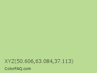 XYZ 50.606,63.084,37.113 Color is a light green color and the nearest color is Pine Glade #c7cd90. Hex code #b9db93 and RGB value is rgb(185,219,147). In RGB color space, this color is composed of 73% red, 86% green, 58% blue, In CMYK color space, this color is composed of 16% cyan, 0% magenta, 33% yellow , 14% black , In HSL color space, this color has a hue angle of 88° , 50% saturation and 72% lightness.
