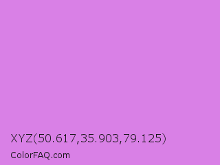 XYZ 50.617,35.903,79.125 Color is a light magenta color and the nearest color is Bright Lilac #d891ef. Hex code #d980e6 and RGB value is rgb(217,128,230). In RGB color space, this color is composed of 85% red, 50% green, 90% blue, In CMYK color space, this color is composed of 6% cyan, 44% magenta, 0% yellow , 10% black , In HSL color space, this color has a hue angle of 292° , 67% saturation and 70% lightness.