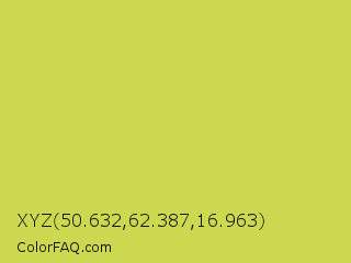 XYZ 50.632,62.387,16.963 Color is a normal yellow color and the nearest color is June Bud #bdda57. Hex code #cbd850 and RGB value is rgb(203,216,80). In RGB color space, this color is composed of 80% red, 85% green, 31% blue, In CMYK color space, this color is composed of 6% cyan, 0% magenta, 63% yellow , 15% black , In HSL color space, this color has a hue angle of 66° , 64% saturation and 58% lightness.