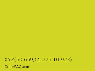 XYZ 50.659,61.776,10.923 Color is a normal yellow color and the nearest color is Bird Flower #d4cd16. Hex code #d1d624 and RGB value is rgb(209,214,36). In RGB color space, this color is composed of 82% red, 84% green, 14% blue, In CMYK color space, this color is composed of 2% cyan, 0% magenta, 83% yellow , 16% black , In HSL color space, this color has a hue angle of 62° , 71% saturation and 49% lightness.