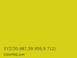 XYZ 50.687,59.959,9.712 Color is a normal yellow color and the nearest color is Bird Flower #d4cd16. Hex code #d6d117 and RGB value is rgb(214,209,23). In RGB color space, this color is composed of 84% red, 82% green, 9% blue, In CMYK color space, this color is composed of 0% cyan, 2% magenta, 89% yellow , 16% black , In HSL color space, this color has a hue angle of 58° , 81% saturation and 46% lightness.