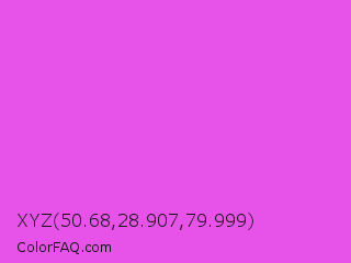 XYZ 50.68,28.907,79.999 Color is a light magenta color and the nearest color is Purple Pizzazz #fe4eda. Hex code #e752e9 and RGB value is rgb(231,82,233). In RGB color space, this color is composed of 91% red, 32% green, 91% blue, In CMYK color space, this color is composed of 1% cyan, 65% magenta, 0% yellow , 9% black , In HSL color space, this color has a hue angle of 299° , 77% saturation and 62% lightness.