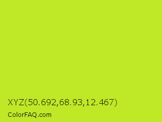 XYZ 50.692,68.93,12.467 Color is a normal lime color and the nearest color is Pear #d1e231. Hex code #bfe826 and RGB value is rgb(191,232,38). In RGB color space, this color is composed of 75% red, 91% green, 15% blue, In CMYK color space, this color is composed of 18% cyan, 0% magenta, 84% yellow , 9% black , In HSL color space, this color has a hue angle of 73° , 81% saturation and 53% lightness.