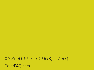 XYZ 50.697,59.963,9.766 Color is a normal yellow color and the nearest color is Bird Flower #d4cd16. Hex code #d6d118 and RGB value is rgb(214,209,24). In RGB color space, this color is composed of 84% red, 82% green, 9% blue, In CMYK color space, this color is composed of 0% cyan, 2% magenta, 89% yellow , 16% black , In HSL color space, this color has a hue angle of 58° , 80% saturation and 47% lightness.